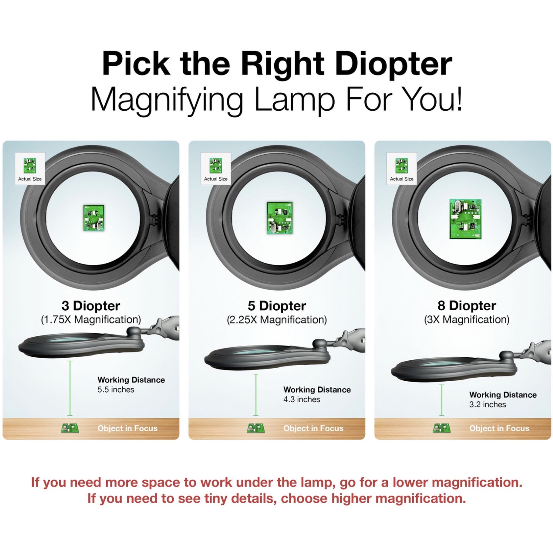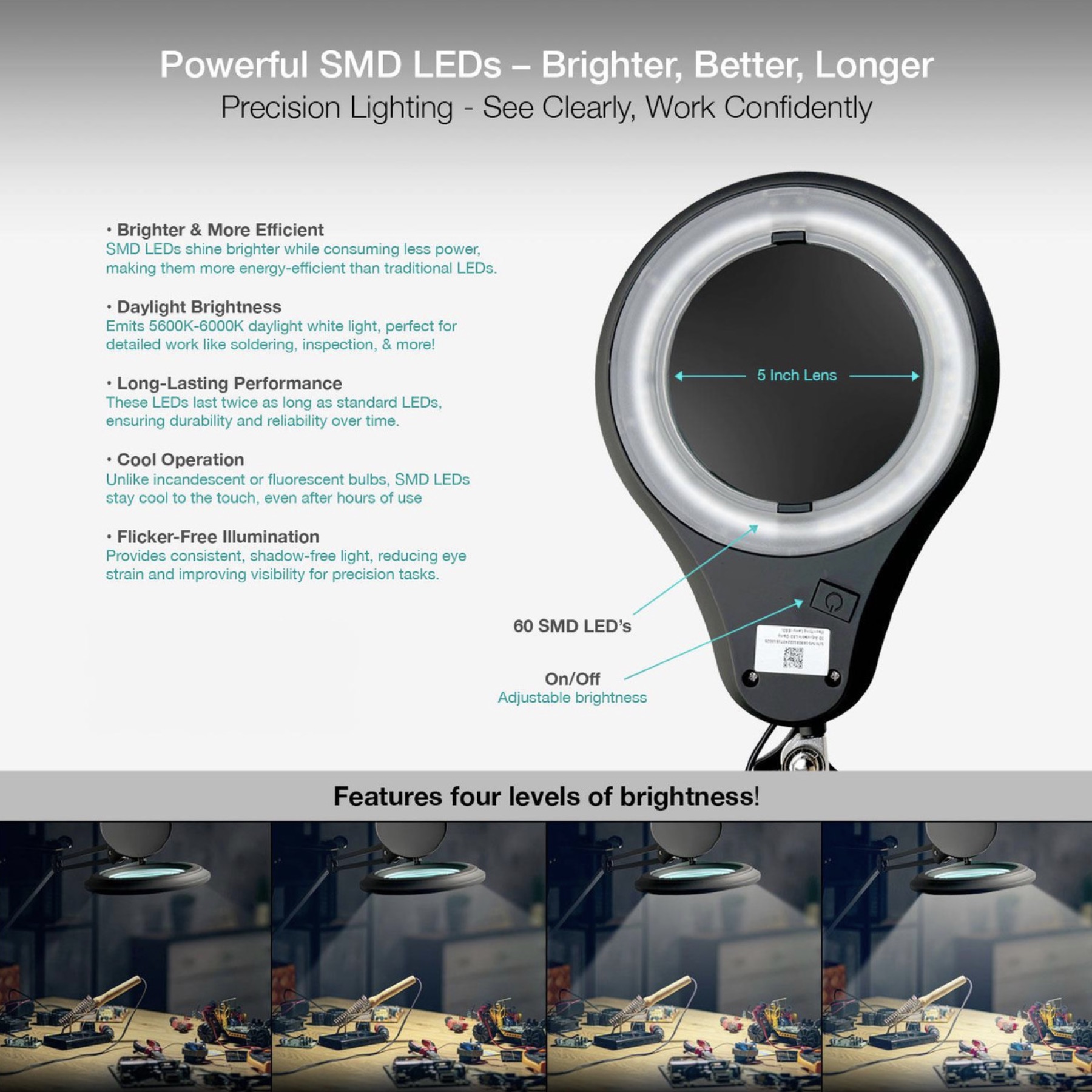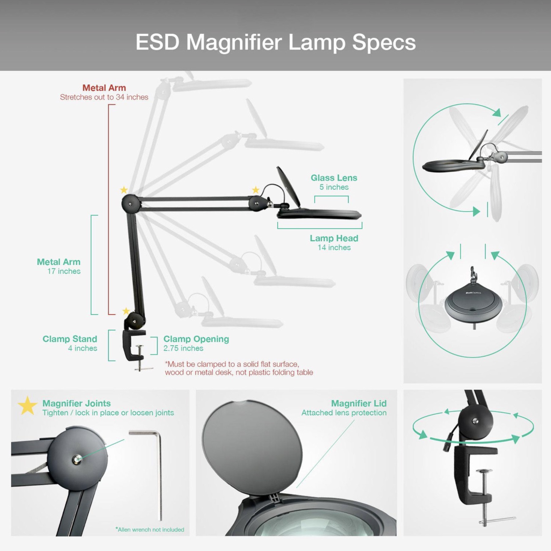 ESD Safe LED Magnifying Lamp, 2.25X Magnification, 5 Diopter, 5″ Lens, Flip Cover, Clamp