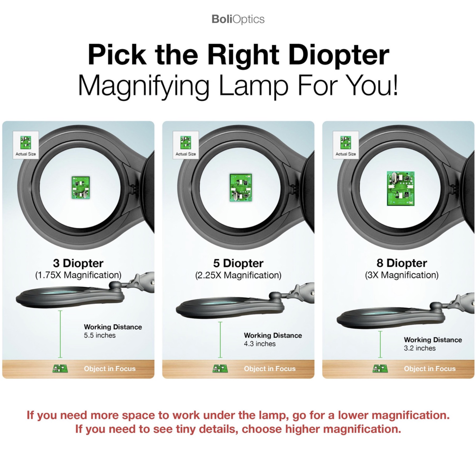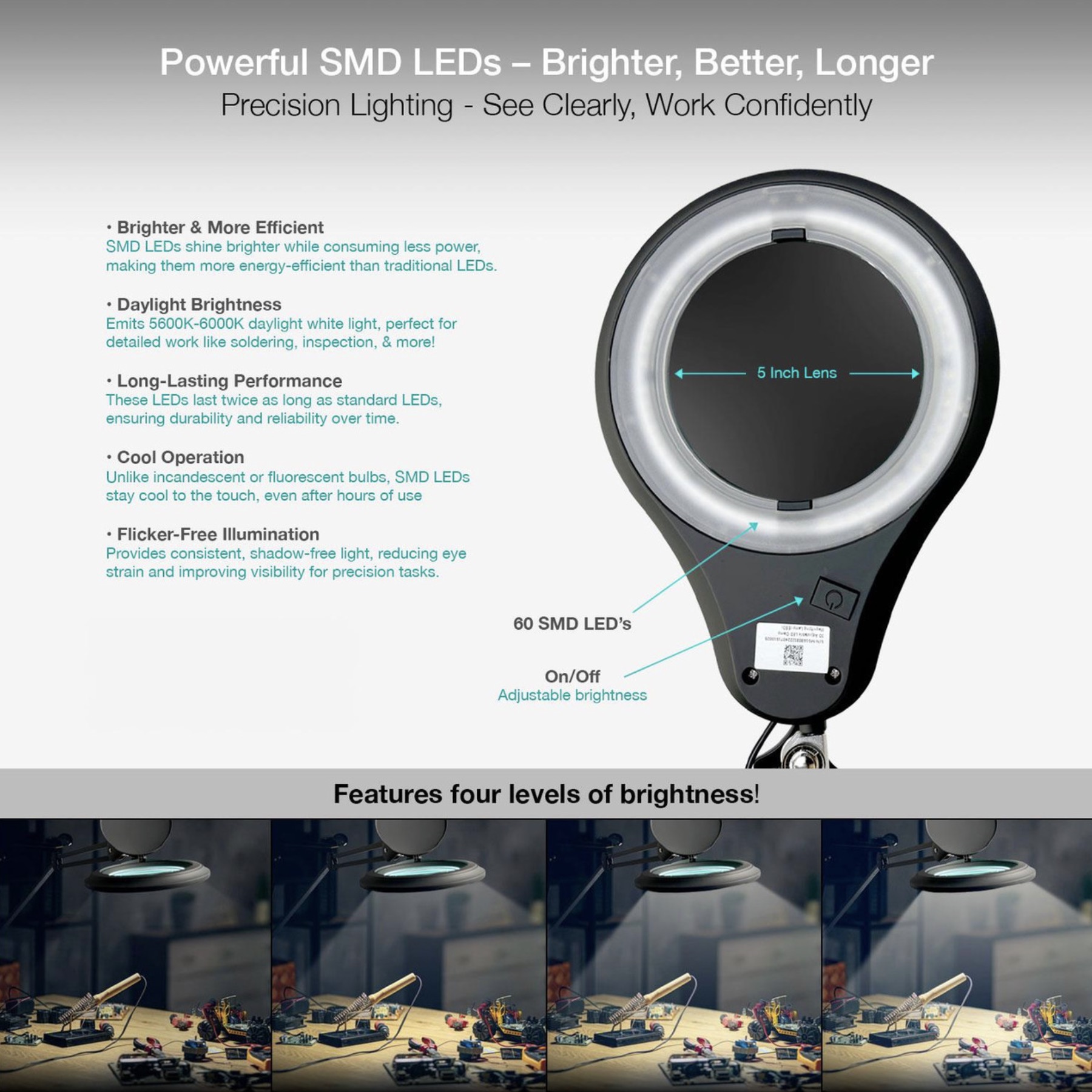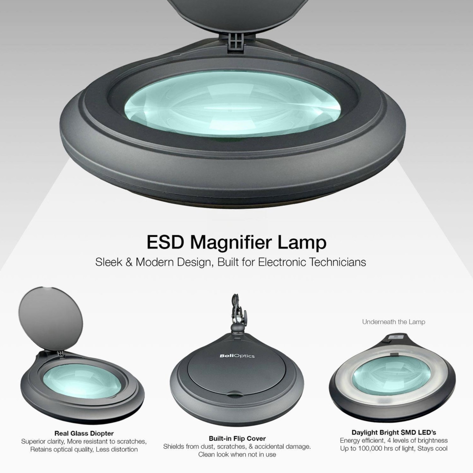ESD Safe LED Magnifying Lamp is ergonomically designed for SMT/PCB inspection, with large viewing areas and reduced stress. The large 5″, 3x magnification optical lens provides enough power for quick inspection, rework, and assembly for micro-electronic and medical device industries.