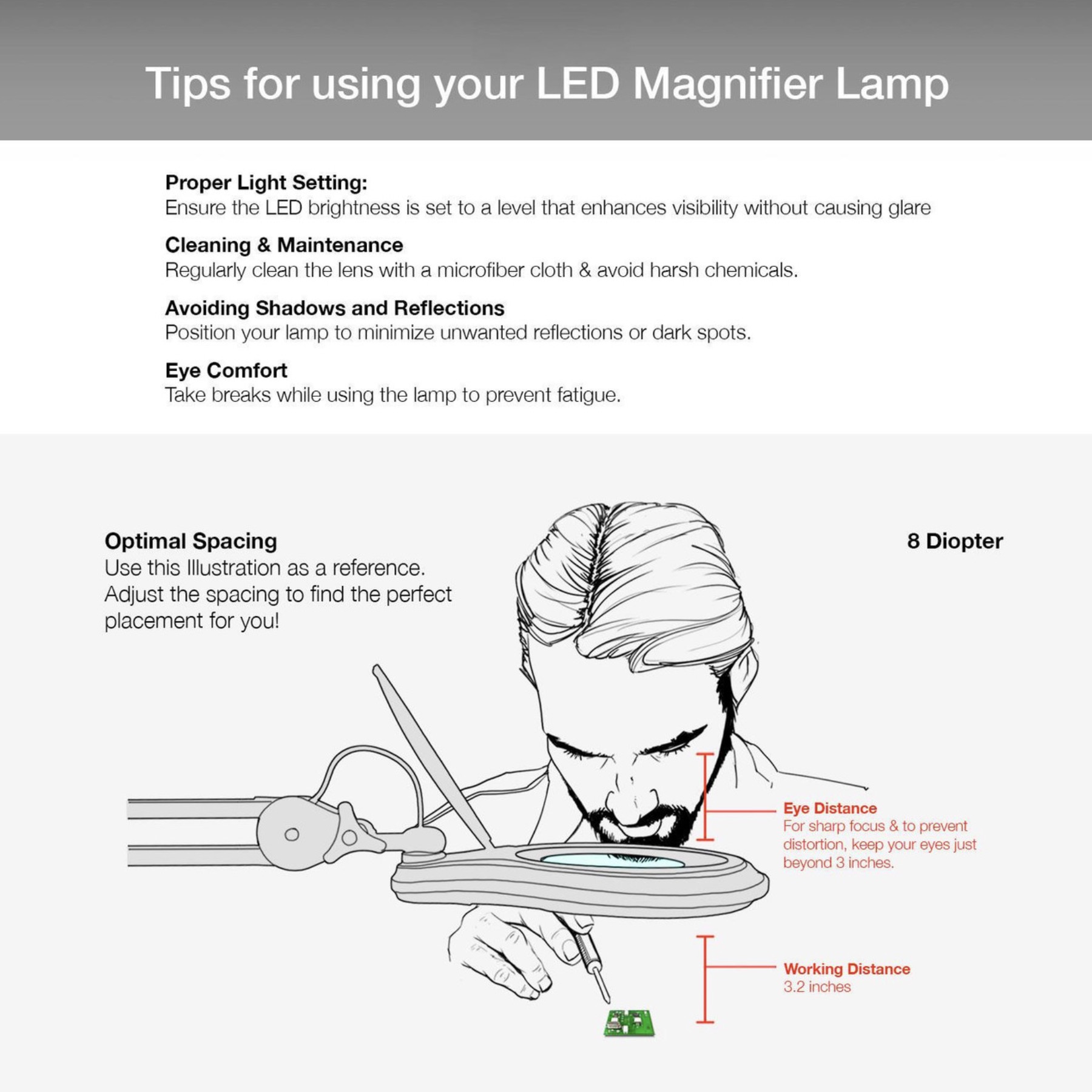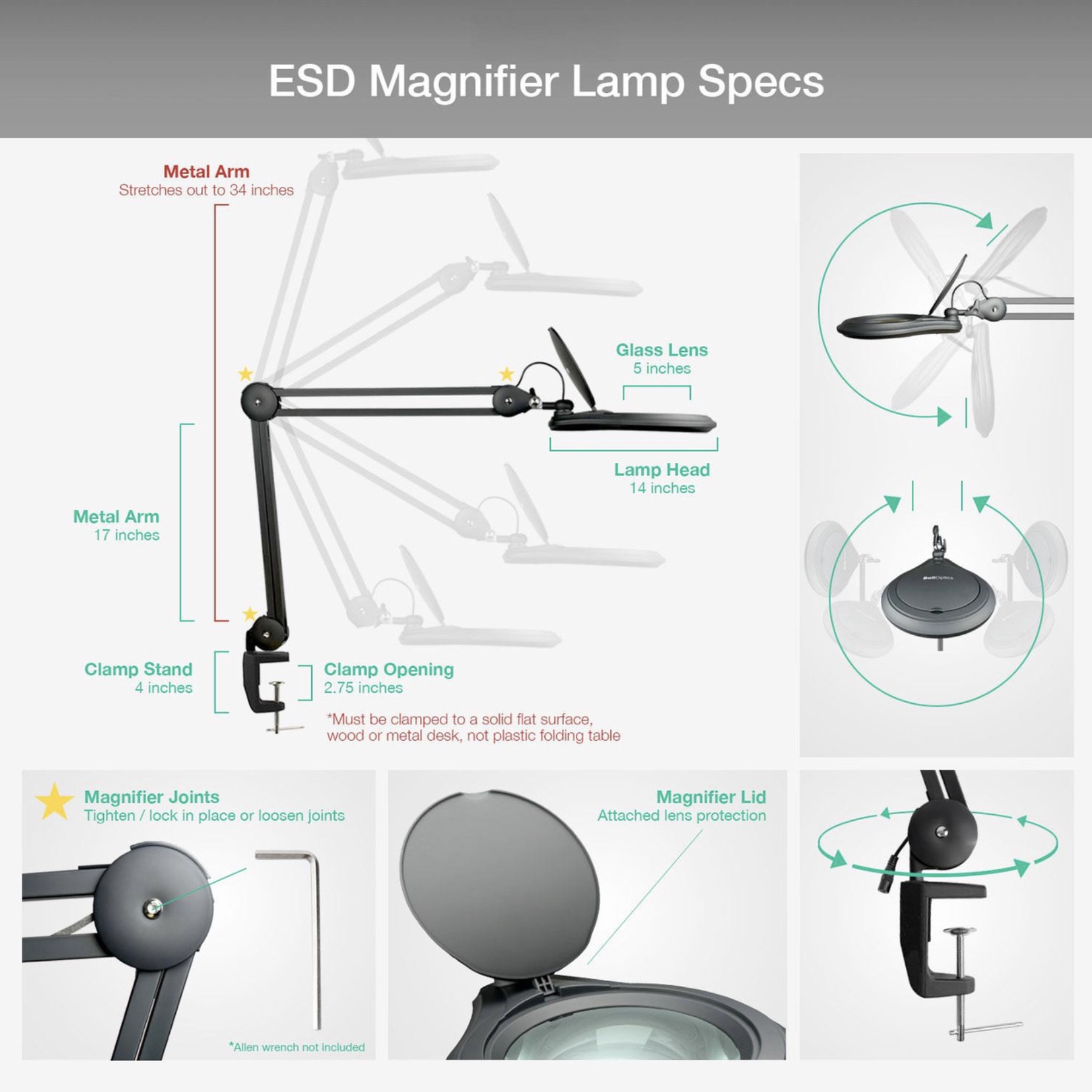 ESD Safe LED Magnifying Lamp, 3X Magnification, 8 Diopter, 5″ Glass Lens, Flip Cover, Clamp